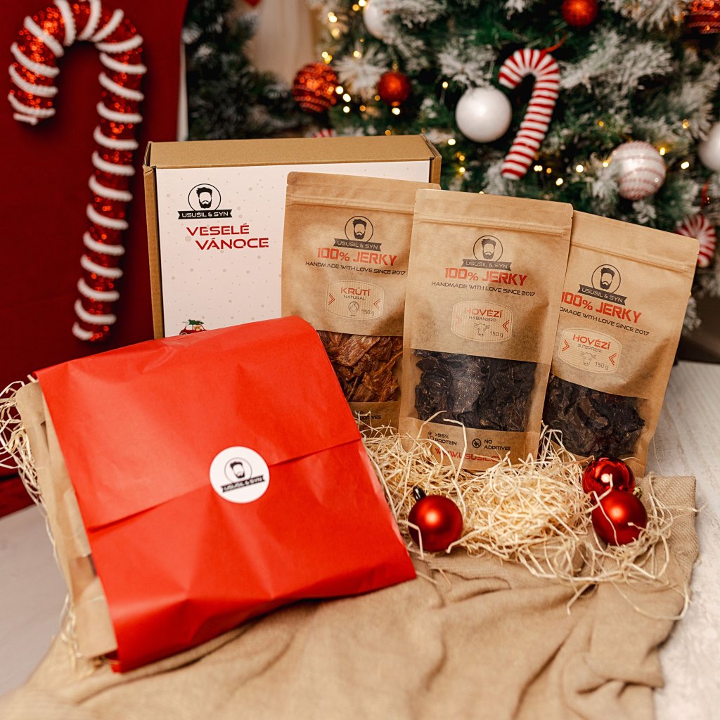 MILUJU, DĚKUJU, PŘEJU... Řekni to masem! Porce 3x 50 g Jerky v dárkové kazetě přesně na míru obdarovanému šťastlivci. Nyní v novém vánočním "kabátu".